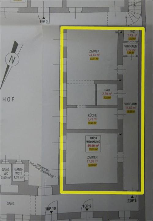 Das Wohnungseigentumsobjekt Top 8 befindet sich im Erdgeschoss des Seitentraktes und besteht aus einem Vorraum, einem WC mit Vorraum, einem Bad, einer Küche und zwei Zimmer. Das Objekt ist westseitig ausgerichtet. Die Raumhöhe beträgt rund 3,20m
